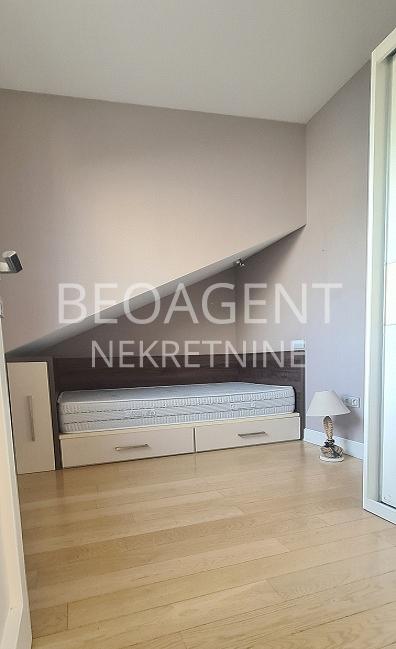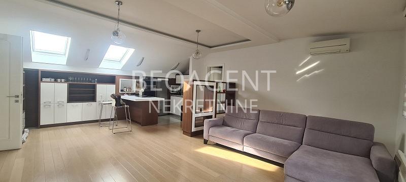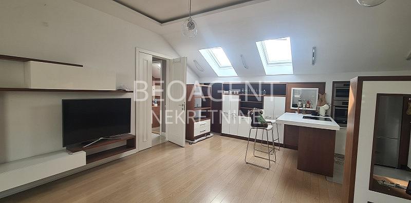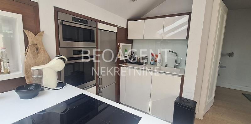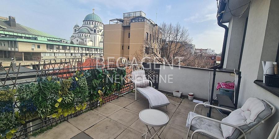 U mirnoj ulici nadomak Hrama Svetog Save u Rankeovoj ulici,u prilici smo da vam ponudimo luksuzan,opremljen stan na četvrtom spratunove stambeno-poslovne zgrade. Zgrada ima četiri sprata sa po jednim stanom na svakom spratu. Ovaj stan je u potpunosti opremljen najsavremenijom tehnikom i modernim nameštajem. Elegantan,savremen stan sa odličnom toplotno-zvučnom izolacijom,svetao i udoban a čine ga: -ulazni hodnik -toalet -veliki dnevni boravak sa izlaskom na terasu,površine 30m2 sa panoramskim pogledom ka Hramu i Beogradu -kuhinjsko-trpezarijski deo kupatilo u sklopu odvojenog spavaćeg dela Stan ima svoj video interfon,katv,klima uređaj,lift. Grejanje je etažno na struju. U sklopu stana je i jedno garažno mesto po dogovoru sa vlasnikom. Samo odabrani klijenti. Za svaku preporuku! Agencijska provizija 50% reg.br. 070